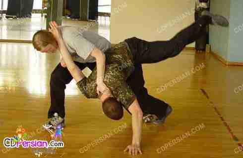 - آموزش در مقابل مهاجم هنگامي كه با آرنج و از پشت سر ،گردن شما را گرفته است.