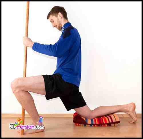 حرکت چهارم: شکم با چوب ایستادهچوب را بادست های خود به فاصله عرض شانه بالای سر نگه دارید و همزمان با پایین آوردن چوب پای راست را در شکم جمع کنید؛ به شکلی که با کمک بالاتنه و پایین تنه انقباض عضلات شکم را کاملا احساس کنید و در عضلات چهار سر ران هم انقباضاتی داشته باشید.